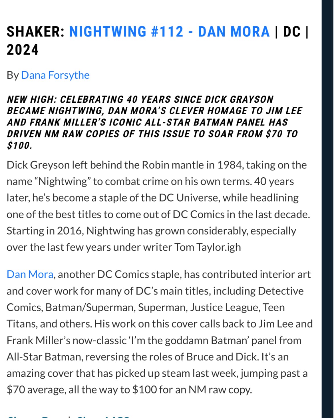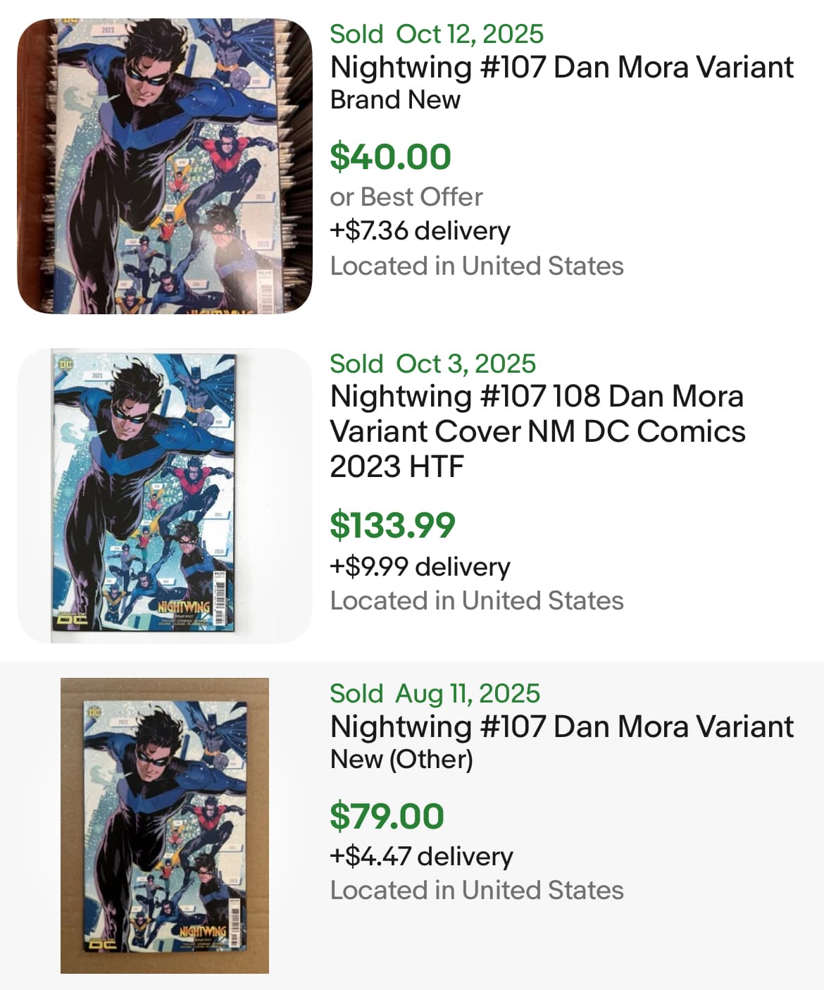 I was going to list my copy of Nightwing 107 (Mora) later for $125. As $142 was the lowest price as of yesterday (and only one copy, located in Canada.)