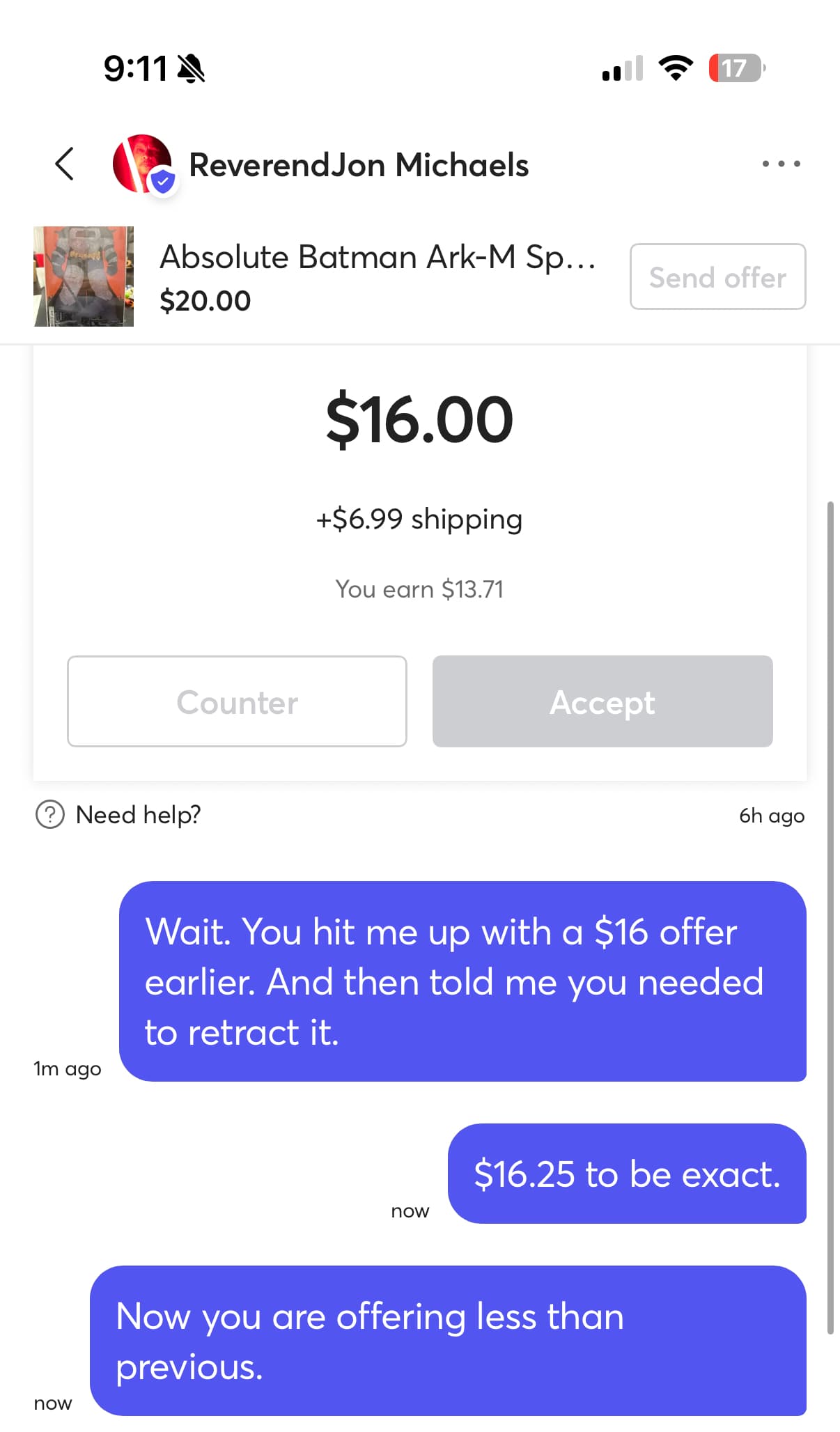 I list another one. He hit me up with a lower offer. So being me and having no filter I have to say something