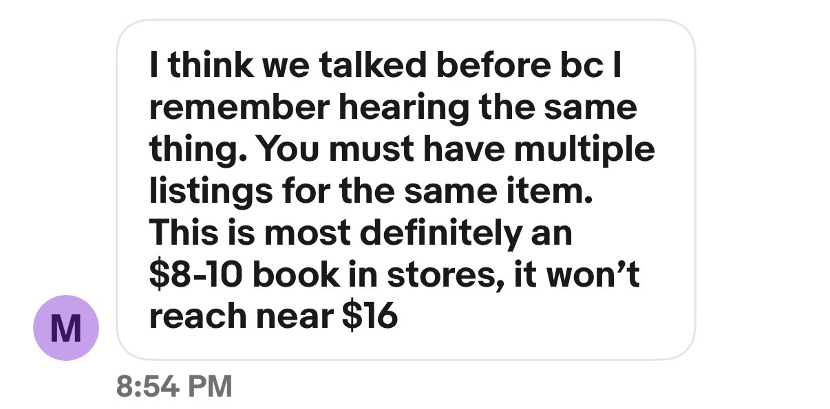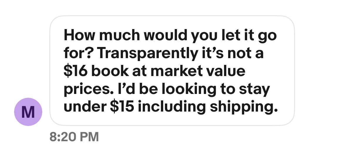 That’s my take, seems too exhausting for my taste to spend so much time on a $15 book. Either buy it or don’t. I don’t even think I would even bother someone for anything under $20 to try and squeeze a few more dimes off the price…