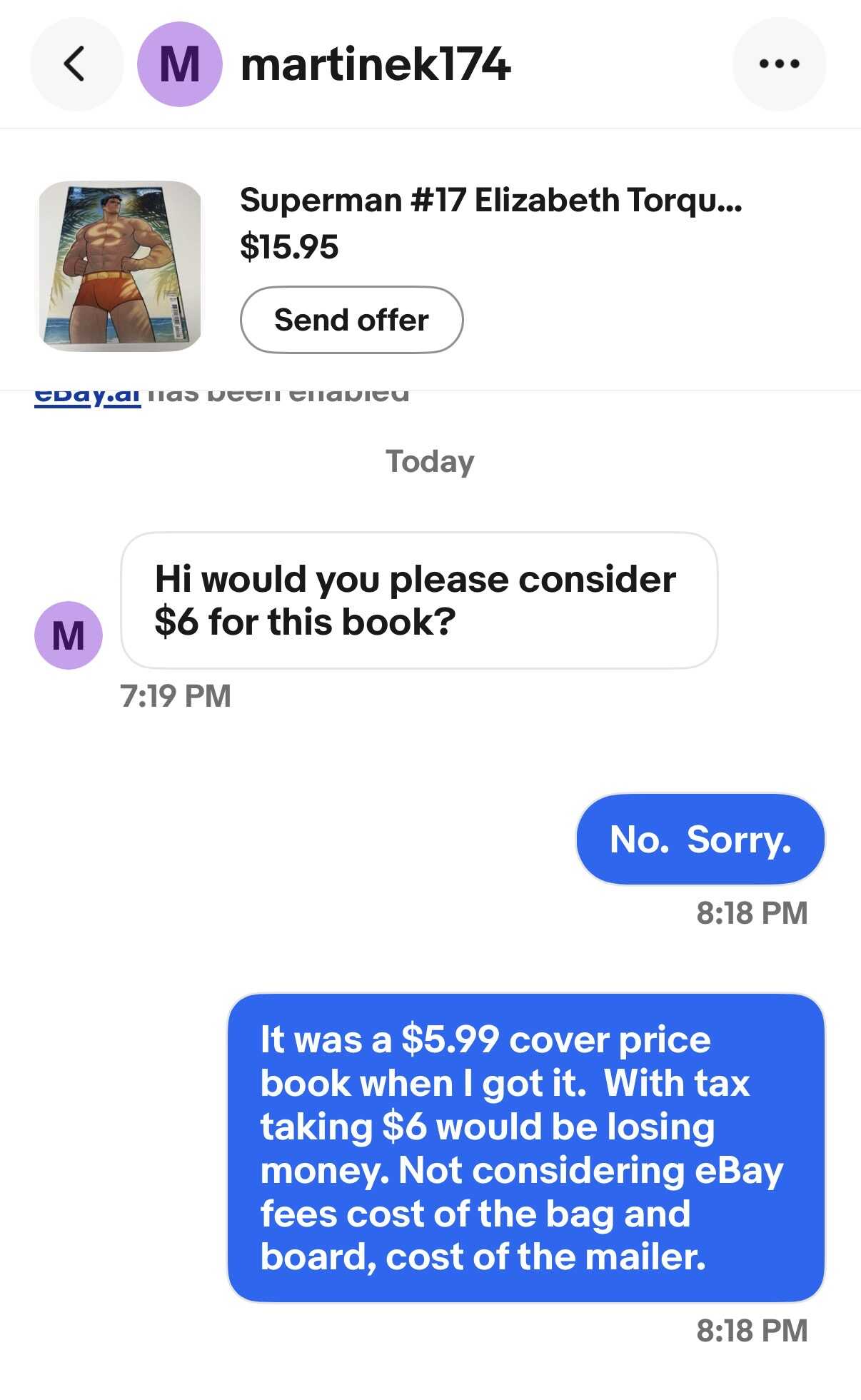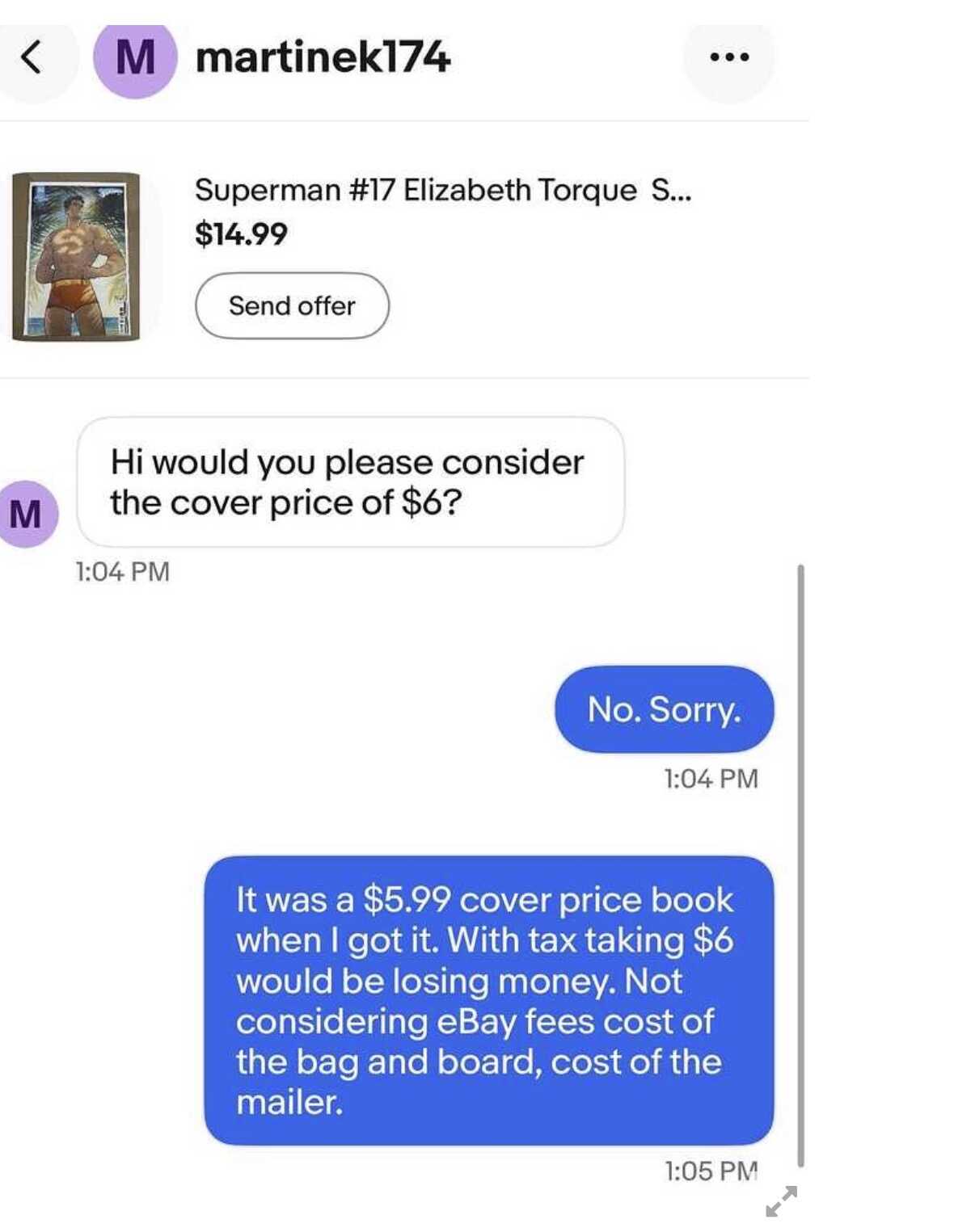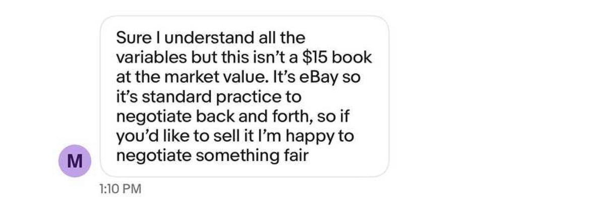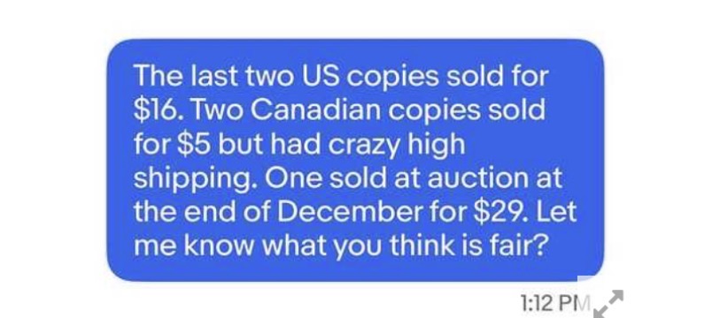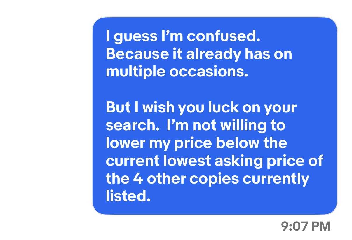 But yeah, squabbling over a few bucks on such a low sale is just dumb regardless of market value… I would have just ignored him after he initially offered $6. Responding just opens up the world of tedious time wasting headaches if you ask me.