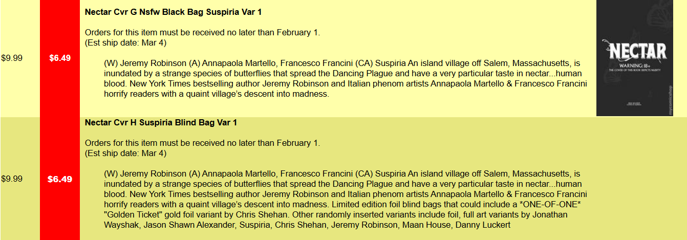 Weird; Midtown shows H as a randomly filled Foil. I don’t know what the deal is with this book. I’m just getting the Cover G Suspiria.