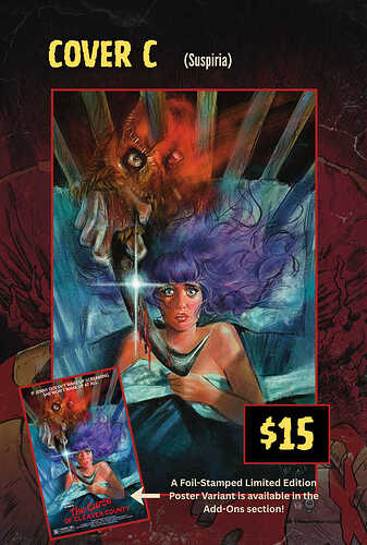I’m doing the regular, foil & metal covers for both Suspiria and Shubina. I also added on the Suspiria Foil Stamp poster homage.