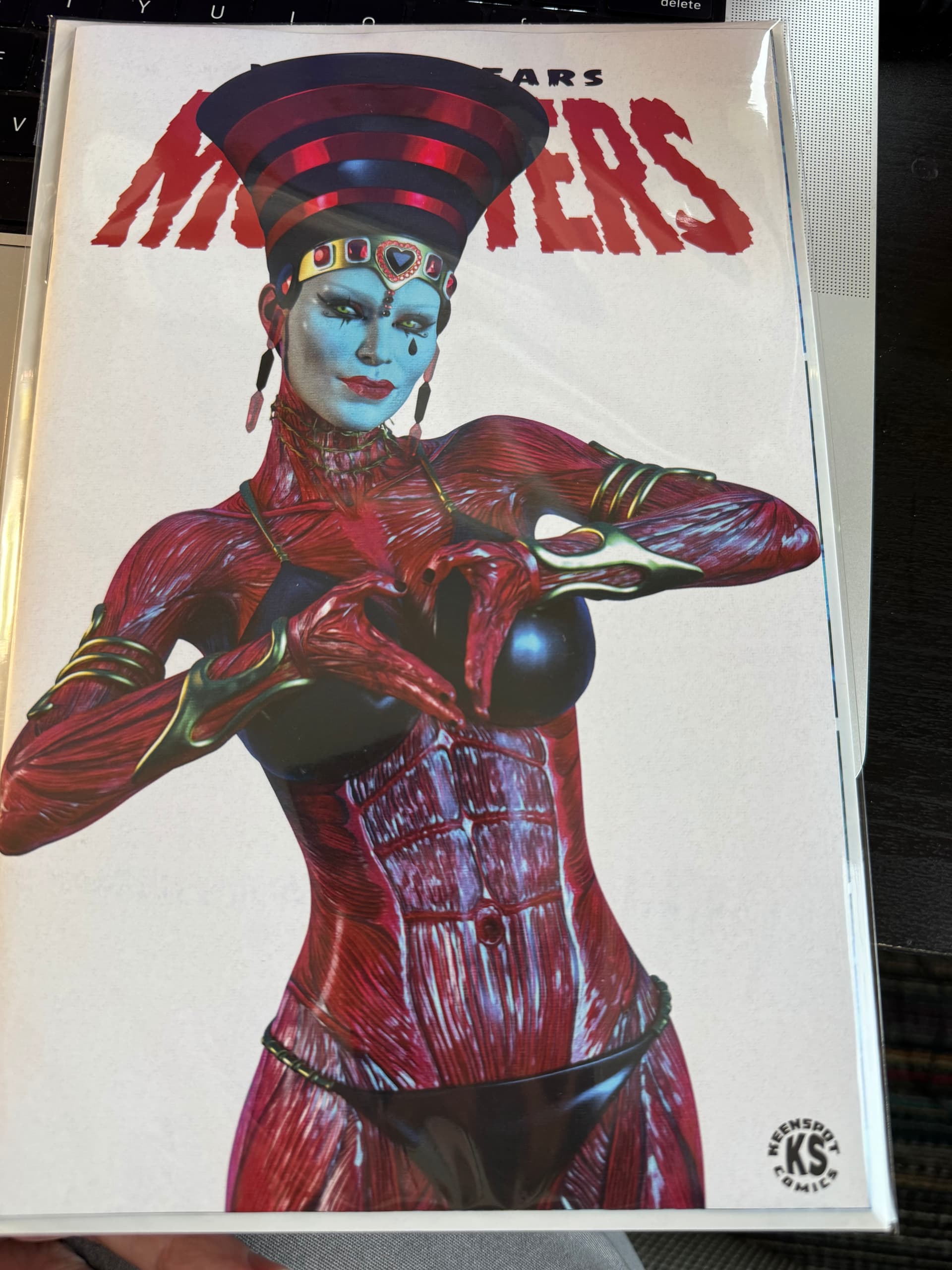 I bought just one issue 8 blind bag, and I’m not even sure why I did that. Just for the gamble, I guess. I really am not a fan of his art or writing. Got this one. I don’t know why the skinless Egyptian lady is making a 2024 heart symbol. She’s in a bikini, so maybe she’s tanning her non-skin?
