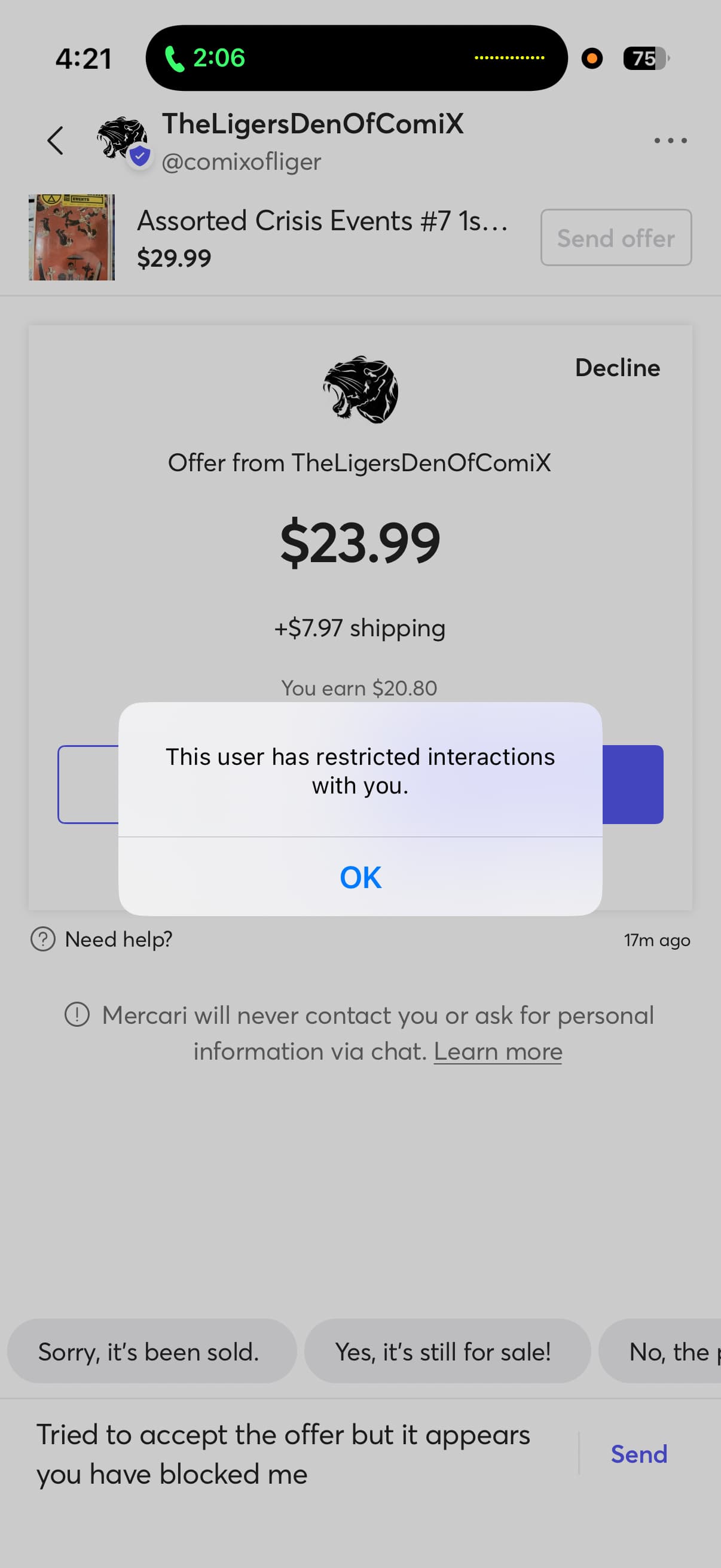 This has happened to me so many times. Someone puts an offer on a book and then blocks me. Makes no sense. I canât send him a message and ask whatâs up because I am blocked.