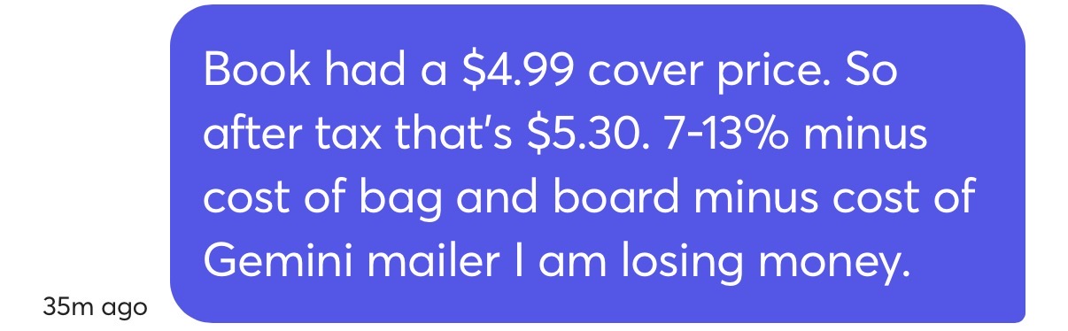 Guy really is an idiot. I explained all that to him and he still wanted the book for $10 shipped. Which after Mercari fees of 13% is $8.70 minus cost of $4.99 is $3.71. Minus Gemini is $2.71 minus bag and board is $2.48. Then shipping of $6.99 is -$4.51 And letâs ignore the fact the book sells for $14.99 plus shipping regularly.