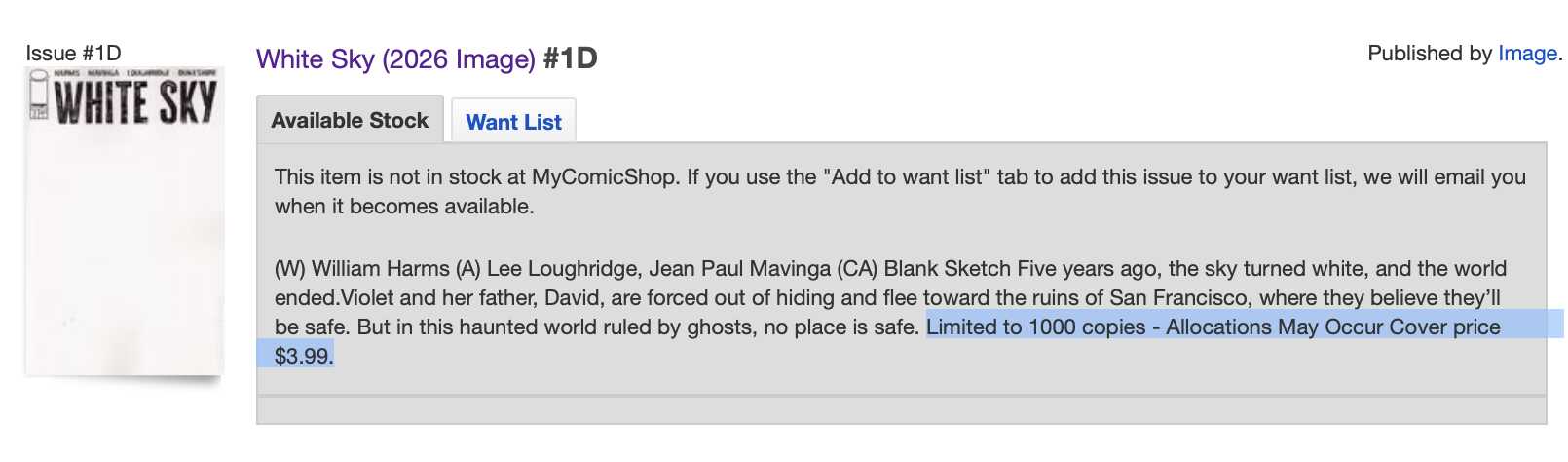 White Sky #1 already looks to be selling for above cover and barely any on eBay. If you didn’t pre-order, keep an eye out on Wednesday.