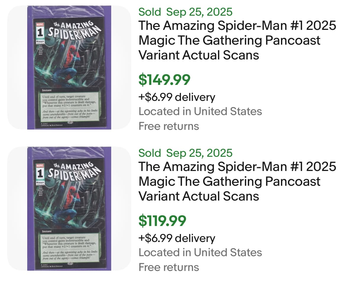 This comic book was sent as a one-per-store cover to retailers… but not comic retailers, game shops! It is meant to be used as a prize for winning the first official MTG: Spider-Man tournament. The promo was intended for use at a special event scheduled for November.