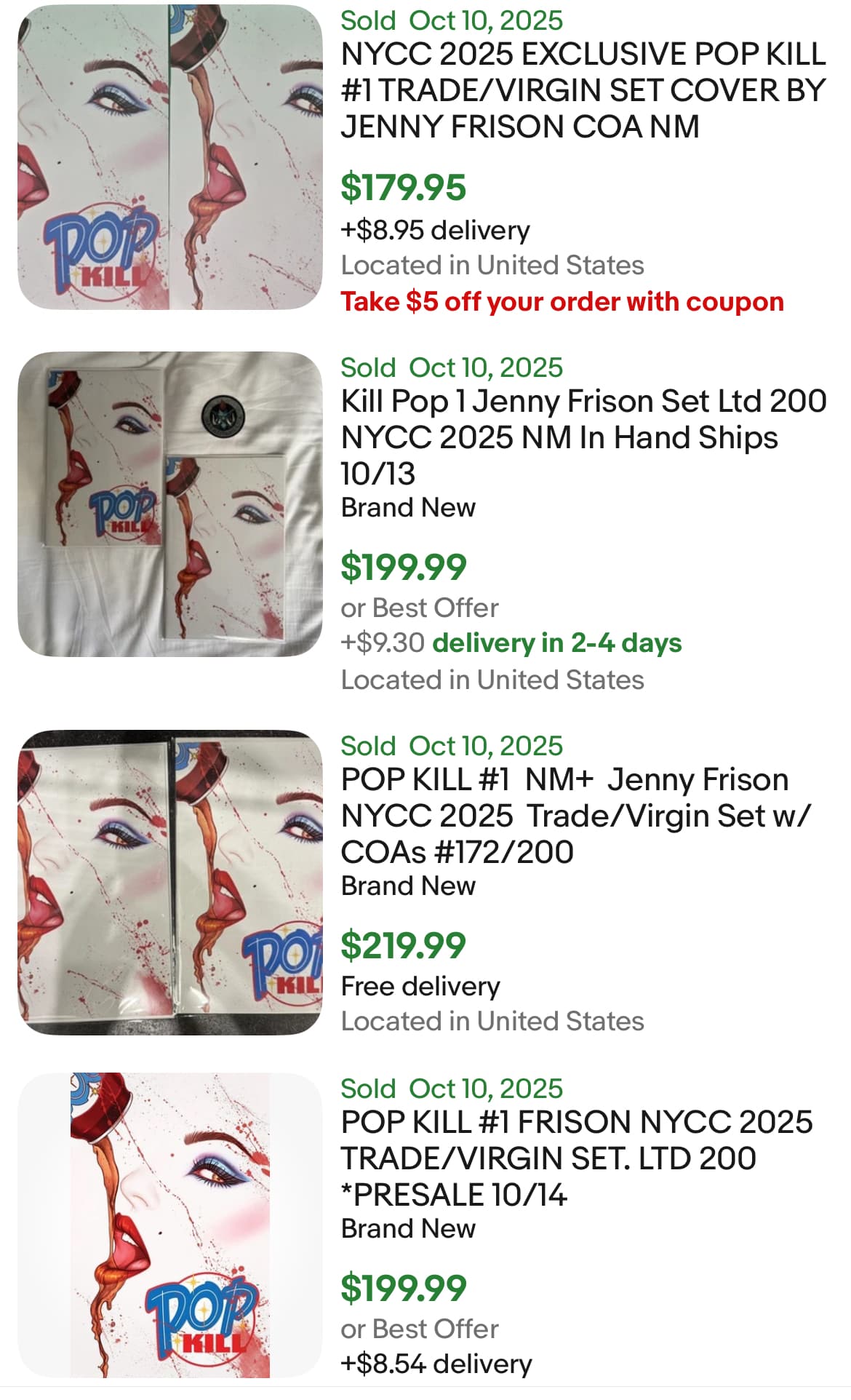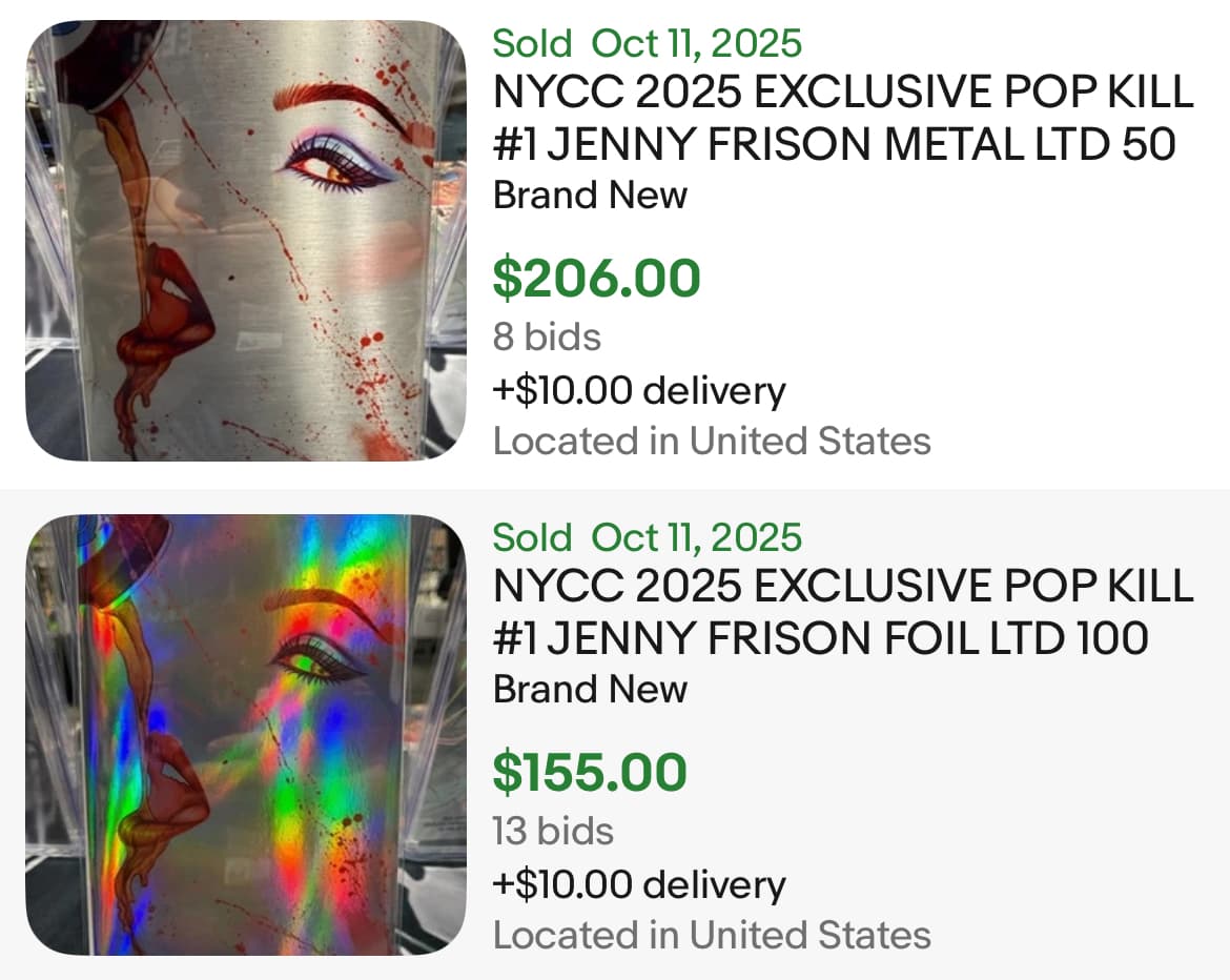 The Pop Kill #1 Frisson variant (limited to 200 Virgin and 200 trade dress), offered by NoMass Comics and Captured Collectibles. The set was $80, but was sold out before the doors opened to the general public (likely dealers all grabbed these up, or certain VIP early entries). So a disappointing for any regular fans looking to score a copy.