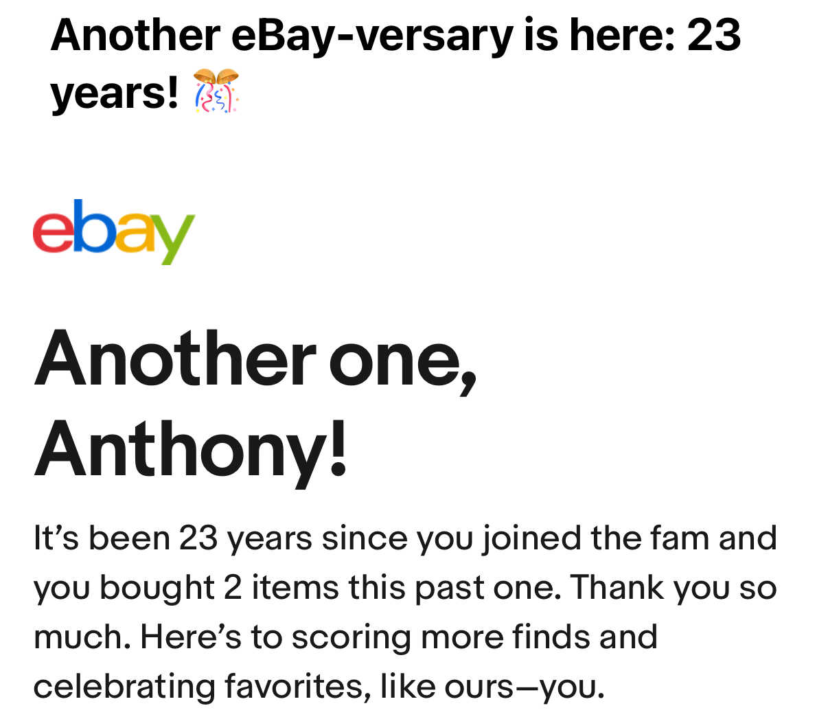 Today is my anniversary. With eBay that is. 23 years on this account. They mention I bought 2 things this year but nothing about the hundreds of items I sold.