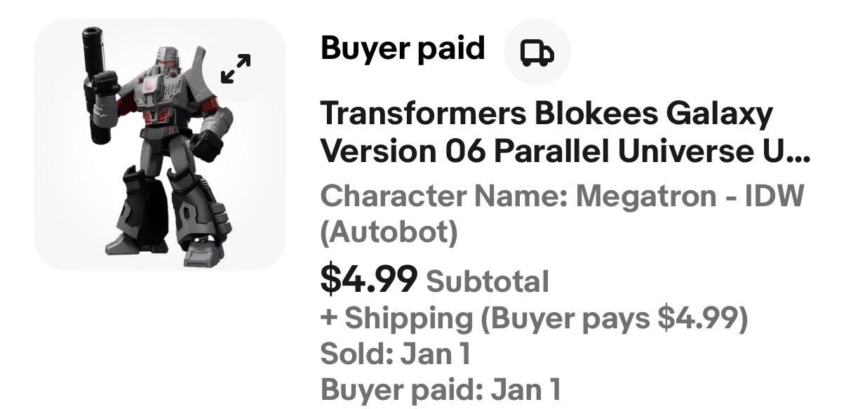 My first sale was a Blokees Megatron. Sold 14 (of 20 I listed) in the last week of various characters.