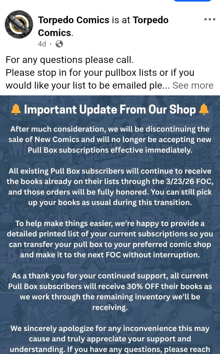 Haven’t been to Torpedo but have always thought they were one of the biggest and most well run comic book shops. Kind of odd that they’re not ordering new comics anymore when it appears that most shops are doing well with new comic sales the past few years with the Ultimate line and Absolute universe. Even indie books are getting a resurgence. Wonder what happened.