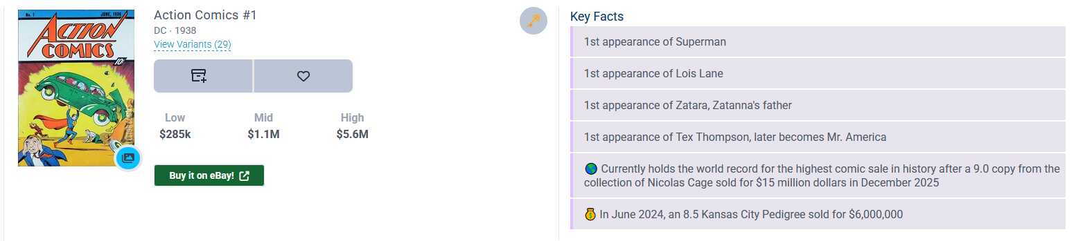 Incredibly, where is the market manipulation warning on Action Comics #1? I mean 8.5 went for $6 million in 2024 and then suddenly in 2025 a 9.0 goes for $15 million??? Buyer Beware! … this book also had a secondary market demand that outpaced the supply