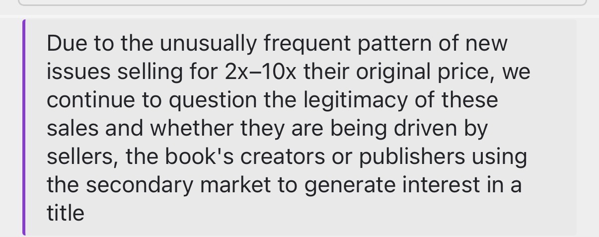 Oh I agree. Thats why I put it on my picks of the week. But what we are seeing is books getting hot and them shouting “market manipulation” when a book does get hot. With no proof. And this time he actually said it could be the creators causing hype to drive up the prices. But the thing is, they make their money off books being wholesaled to the distributors. They don’t make money off the secondary market.