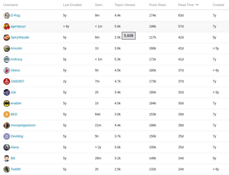 Here’s the top users based on time spent on the forums, with a few other stats…