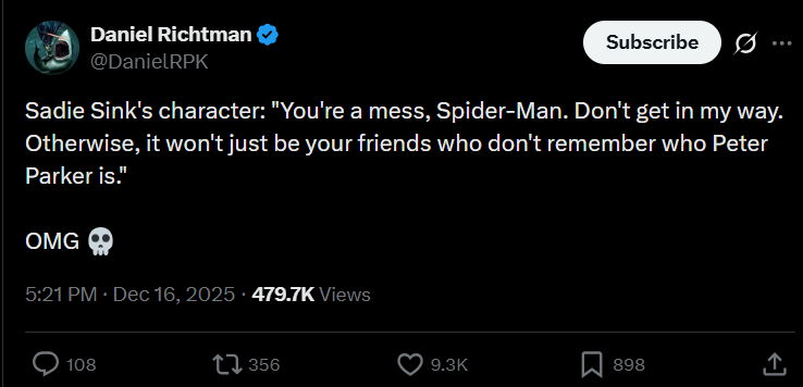 The trailer reportedly features Sadie Sink in a villain role, warning Peter Parker not to interfere. Peter is shown struggling to control his abilities, including a moment where he wakes up trapped inside a web-like cocoon. The footage also teases the Red Ninja clan, the Boomerang villain, appearances by Bruce Banner and The Punisher, and a glimpse of Mac Gargan wearing his prison outfit.
