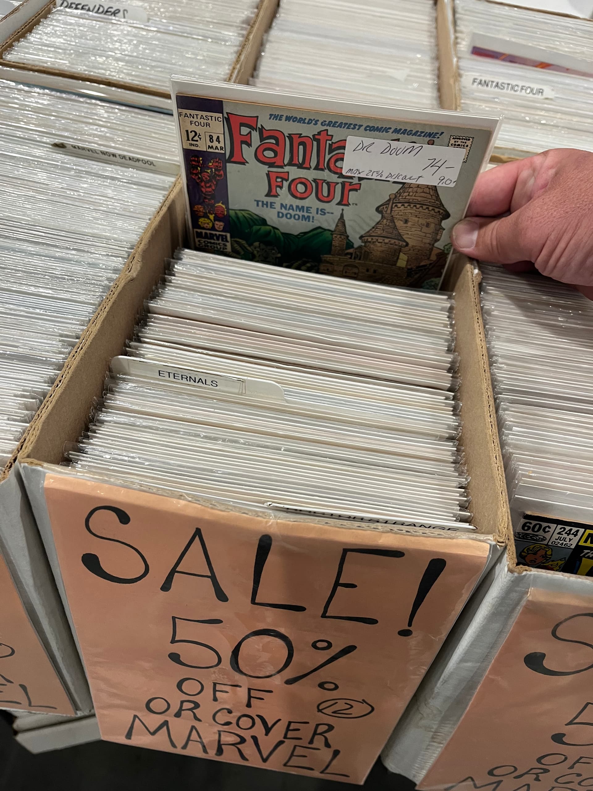 So, here’s a really annoying one. This vendor had all these boxes with this 50% off or cover. But then many of the labels had some special notation, like “max 20% discount” as if to contradict was on the front of the long box.